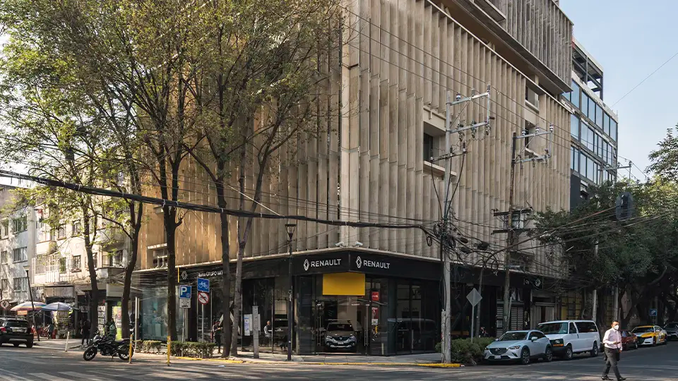 El proyecto de 3,200 m2 rescata un inmueble dañado en el sismo de 1985, reactivado con un programa de uso comercial y de oficinas. Se formó un cubo protegido con doble fachada a base de una celosía estructural de mármol que logra un control solar y crea balcones para tener una ventilación pasiva.